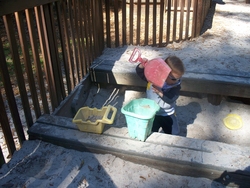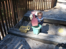 Andrew digging for dinosaurs in his sandbox. It's really funny to hear him try to say paleontologist.