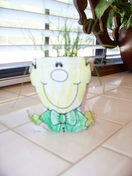 ![]() Fri 01 Oct 2010 03:19:30 PM Another one of Andrew's art projects -- this "guy" is pasted to a styrofoam coffee cup full of dirt with grass growing for hair. |