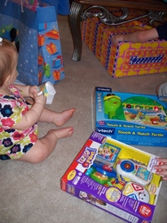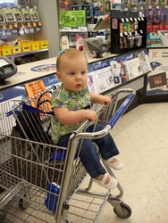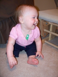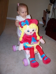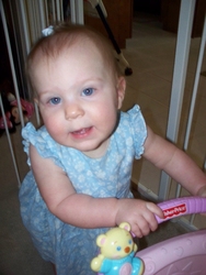 Sun 28 Mar 2010 11:51:50 AM Gracie can't quite walk without support, yet, but she pushes her baby stroller all over the place. |